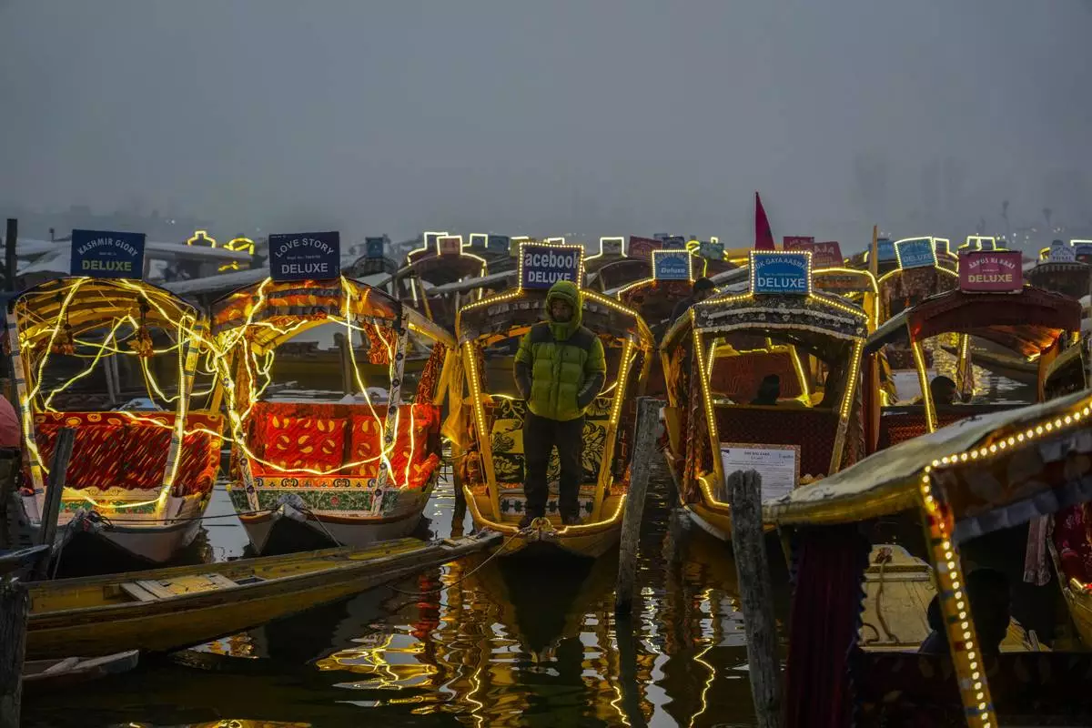 FILE - A Kashmiri boatman stands on his illuminated boat during a laser show and and live concert organized to boost winter tourism in Srinagar, Indian controlled Kashmir, Dec. 7, 2022. (AP Photo/Mukhtar Khan, File)