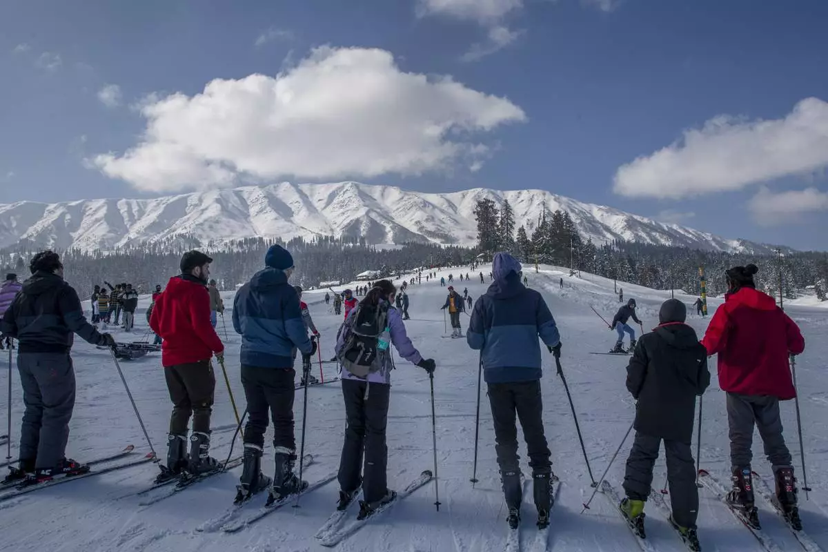 FILE - Tourists wait for their turn to use a ski-lift to transport them up a slope in Gulmarg, northwest of Srinagar, Indian controlled Kashmir, Jan. 10, 2021. (AP Photo/Dar Yasin, File)