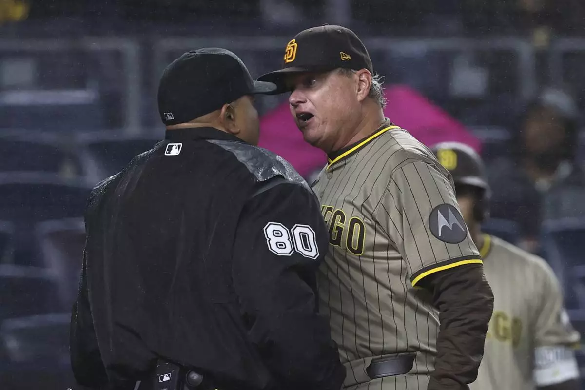 San Diego Padres manager Mike Shildt, right, argues with umpire Adrian Johnson, left, during the eighth inning of a baseball game against the New York Yankees, Monday, May 5, 2025, in New York. (AP Photo/Pamela Smith)