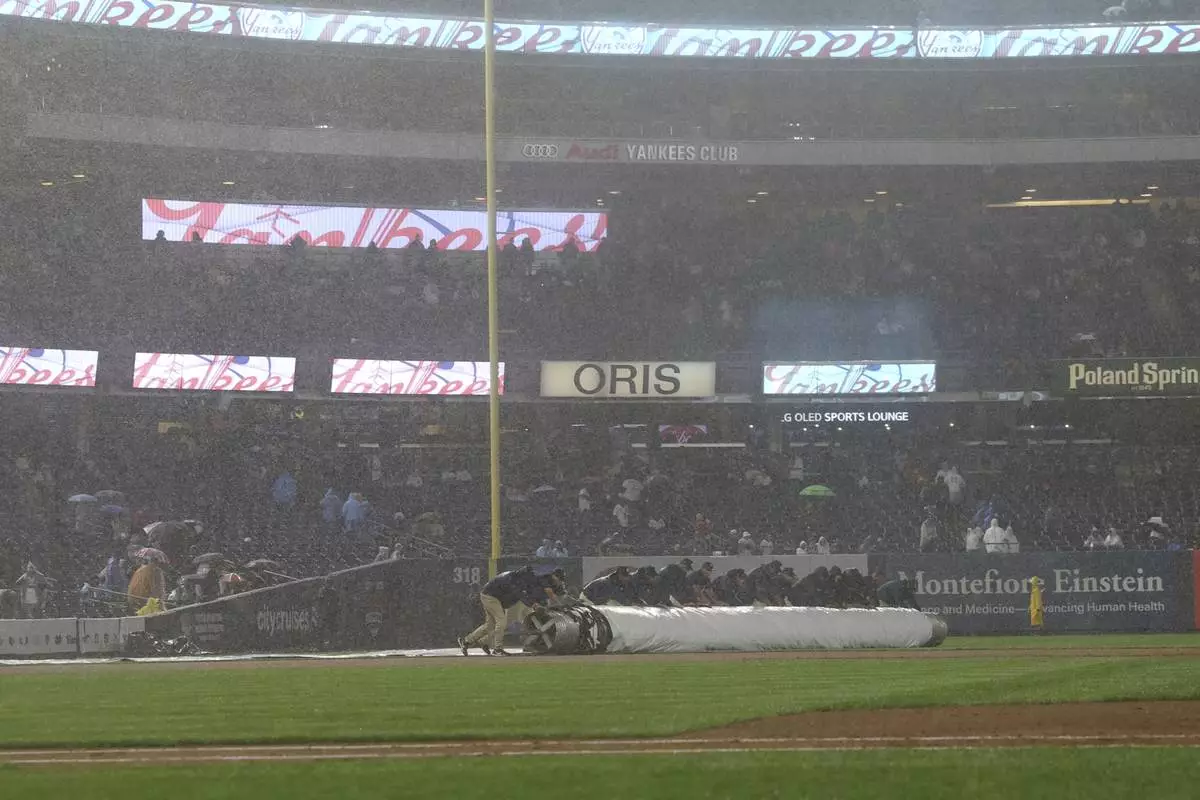Grounds crew members cover the infield during a rain delay in the during the fourth inning of a baseball game between the New York Yankees and the San Diego Padres, Monday, May 5, 2025, in New York. (AP Photo/Pamela Smith)