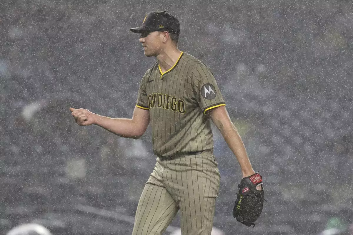 San Diego Padres pitcher Nick Pivetta stands in the rain during the fourth inning of a baseball game against the New York Yankees, Monday, May 5, 2025, in New York. (AP Photo/Pamela Smith)