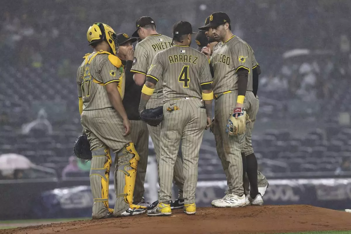 San Diego Padres players talk on the pitcher's mound during the fifth inning of a baseball game against the New York Yankees, Monday, May 5, 2025, in New York. (AP Photo/Pamela Smith)