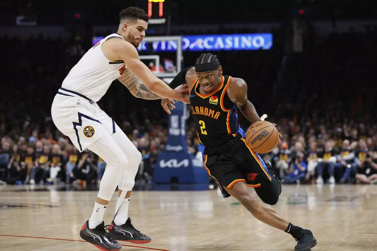 Oklahoma City Thunder guard Shai Gilgeous-Alexander (2) works to get past Denver Nuggets forward Michael Porter Jr., left, in the second half of Game 1 of an NBA basketball second-round playoff series Monday, May 5, 2025, in Oklahoma City. (AP Photo/Nate Billings)