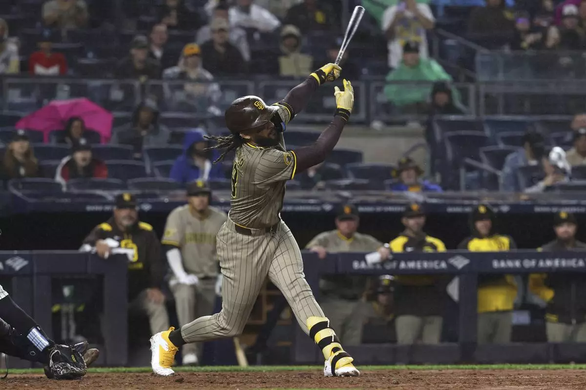 A tantrum by San Diego's manager following the first major league ejection of star slugger Fernando Tatis Jr. fired up the Padres, who overcame a three-run deficit in the eighth inning to beat the New York Yankees 4-3 on a soggy Monday night and extend their winning streak to six.