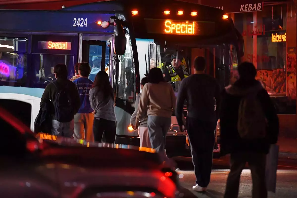 People board a bus in a neighborhood near Brown University, Saturday, Dec. 13, 2025, in Providence, R.I., during the investigation of a shooting. (AP Photo/Steven Senne)