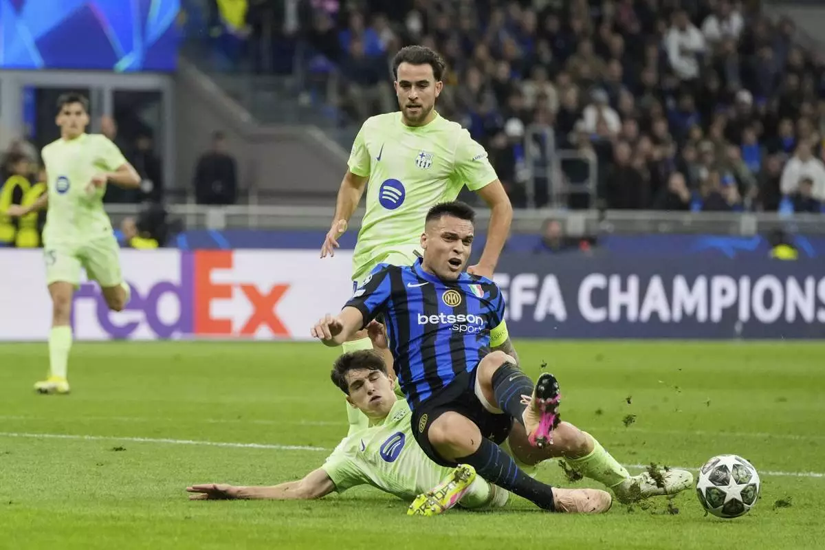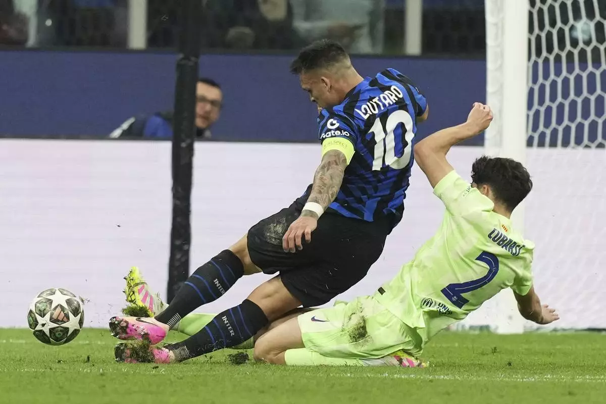 Inter Milan's Lautaro Martinez, right, is fouled by Barcelona's Pau Cubarsi to give away a penalty, during the Champions League semifinal second leg soccer match between Inter Milan and Barcelona at San Siro stadium in Milan , Italy, Tuesday, May 6, 2025. (AP Photo/Luca Bruno)