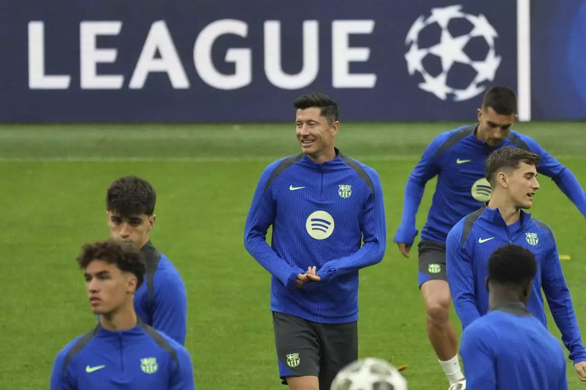 Barcelona's Robert Lewandowski, centre, smiles during a training at the San Siro stadium in Milan, Italy, Monday, May 5, 2025, ahead of the Champions League semifinals second leg soccer match between Inter Milan and Barcelona on Tuesday. (AP Photo/Antonio Calanni)