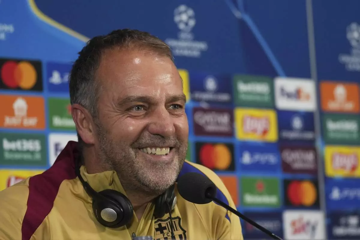 Barcelona's head coach Hansi Flick attends a press conference at the San Siro stadium in Milan, Italy, Monday, May 5, 2025, ahead of the Champions League semifinals second leg soccer match between Inter Milan and Barcelona on Tuesday. (AP Photo/Antonio Calanni)