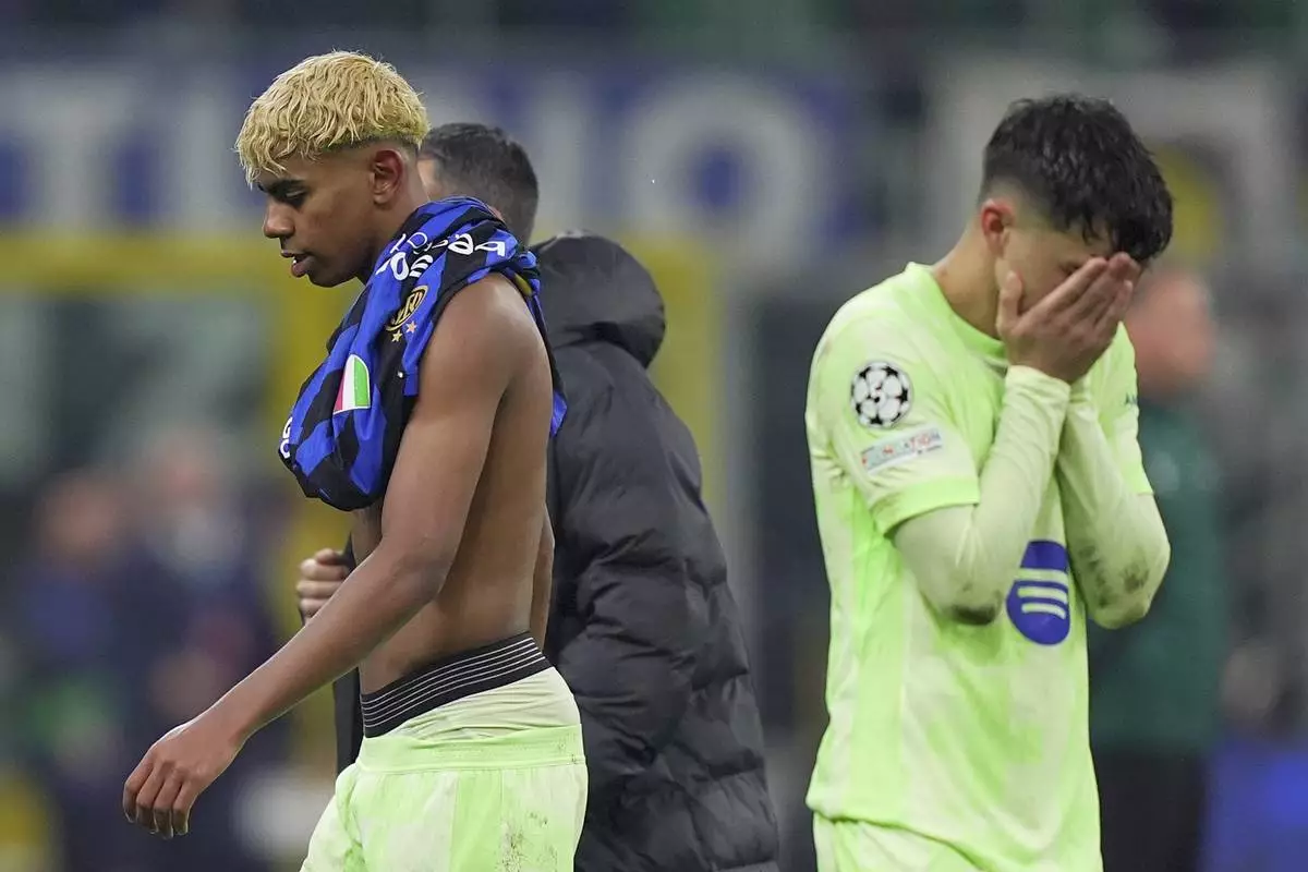 Barcelona's Lamine Yamal, left, reacts after the Champions League semifinal second leg soccer match between Inter Milan and Barcelona at San Siro stadium in Milan , Italy, Tuesday, May 6, 2025. (Spada/LaPresse via AP)