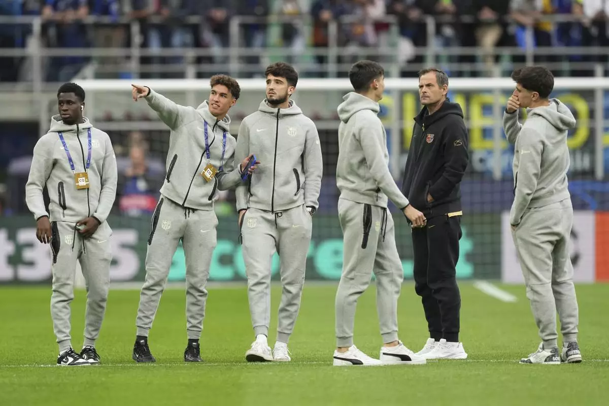 Barcelone players walk onto the pitch before the Champions League semifinal second leg soccer match between Inter Milan and Barcelona at San Siro stadium in Milan, Italy, Tuesday, May 6, 2025. (AP Photo/Antonio Calanni)