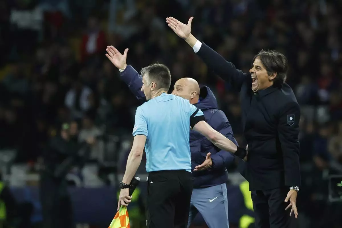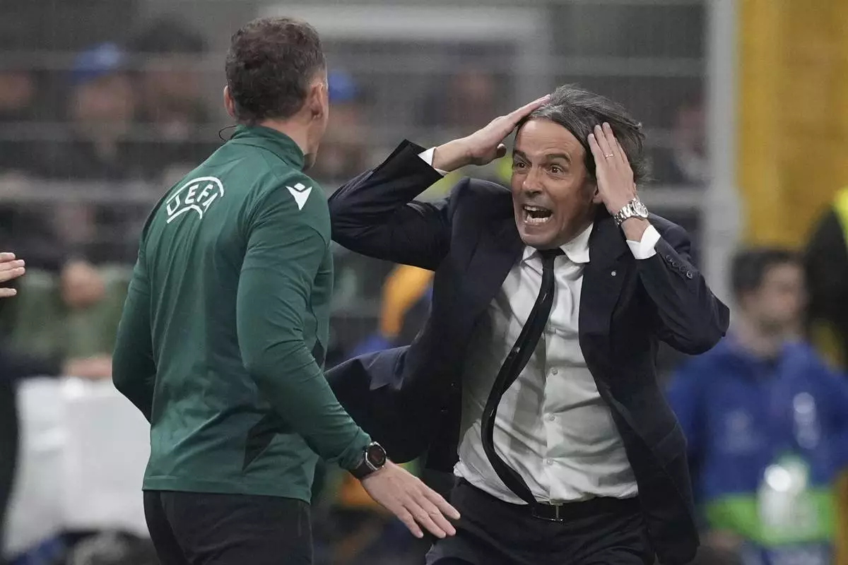 Inter Milan's head coach Simone Inzaghi shouts at UEFA official during the Champions League semifinal second leg soccer match between Inter Milan and Barcelona at San Siro stadium in Milan , Italy, Tuesday, May 6, 2025. (AP Photo/Antonio Calanni)