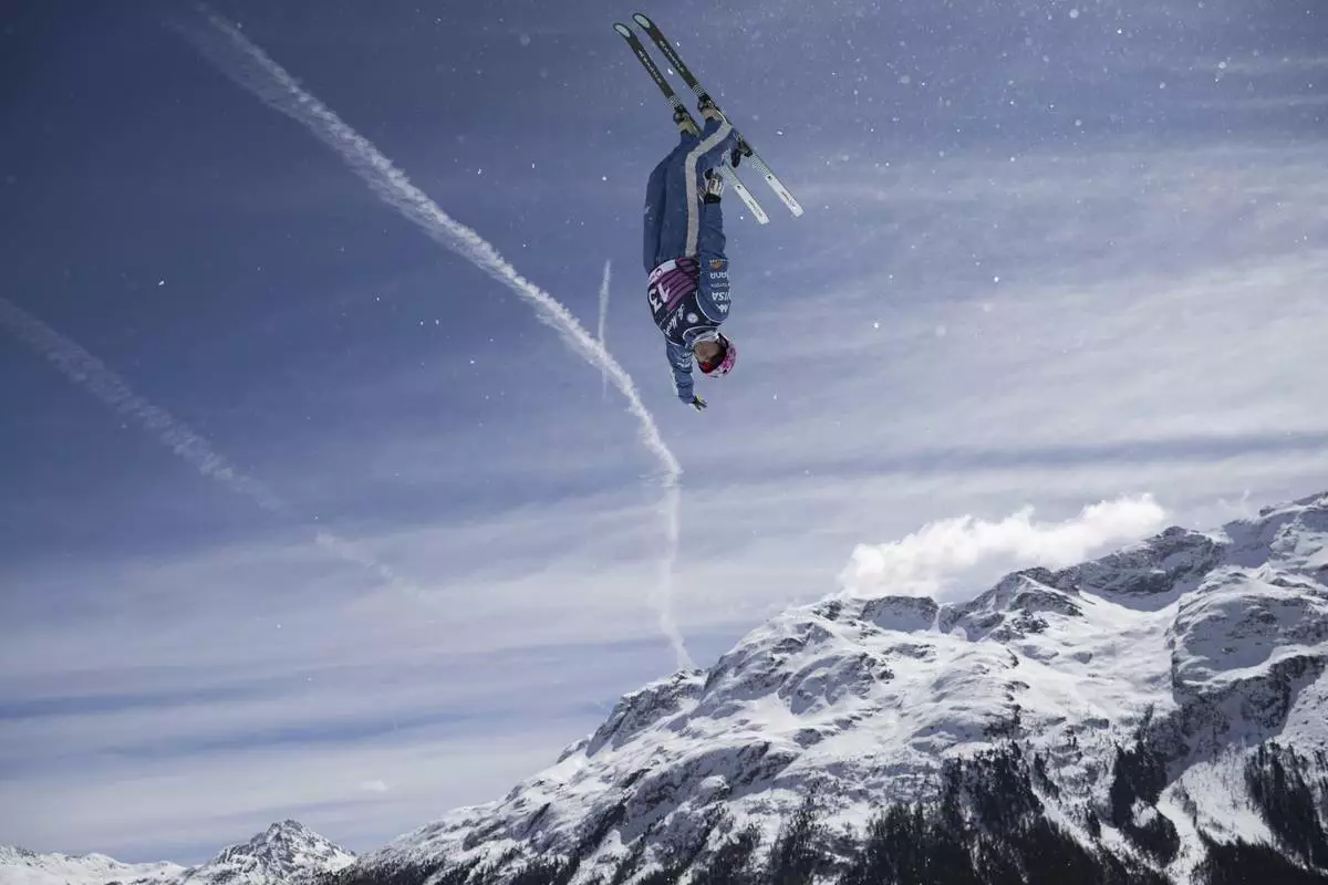 FILE - Dani Loeb of the U.S. competes in the Aerials of the FIS Snowboard, Freestyle and Freeski World Championships in St. Moritz, Switzerland, Sunday, March 30, 2025. (Gian Ehrenzeller/Keystone via AP, File)