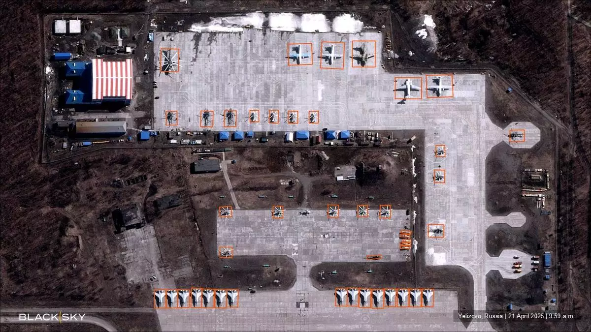 A BlackSky Gen-3 satellite image with AI-enabled analytics highlighting various-sized military planes and helicopters in Yelizovo, Russia, collected April 21, 2025. BlackSky’s advanced, proprietary automated detection and identification algorithms transform very high-resolution Gen-3 imagery into actionable insights at machine speed and scale over strategic and tactical objects of interest.