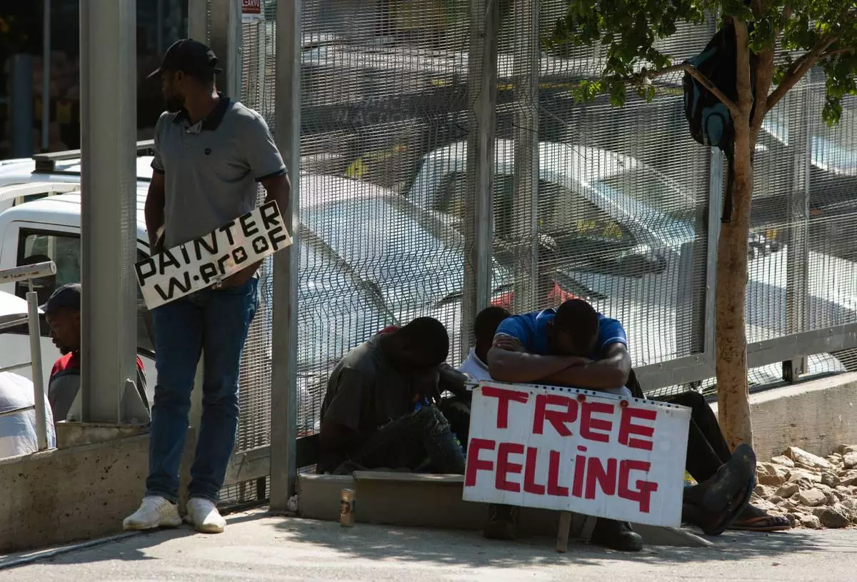 FILE - Workers advertise their skills looking for work outside a hardware store in a Johannesburg suburb, Wednesday, Feb. 26, 2020. (AP Photo/Denis Farrell, File)