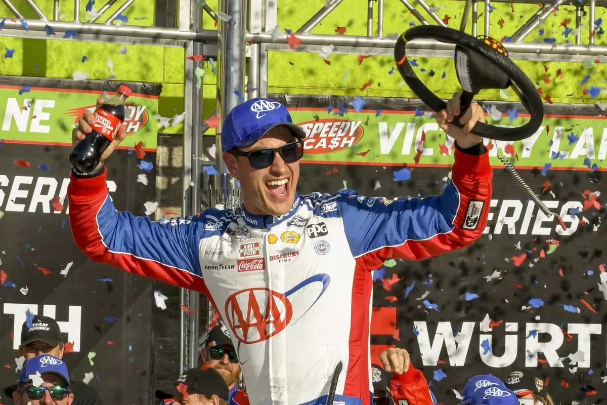 Joey Logano celebrates after winning a NASCAR Cup Series auto race at Texas Motor Speedway in Fort Worth, Texas, Sunday, May 4, 2025. (AP Photo/Randy Holt)
