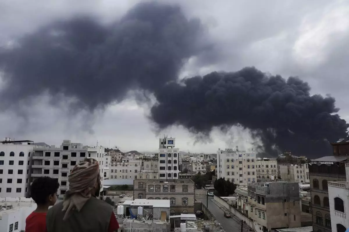 Yemenis watch as smoke billows following Israeli airstrikes targeting a power plant and Sanaa Airport, in Sanaa, Yemen, Tuesday, May 6, 2025. (AP Photo/Osamah Abdulrahman)