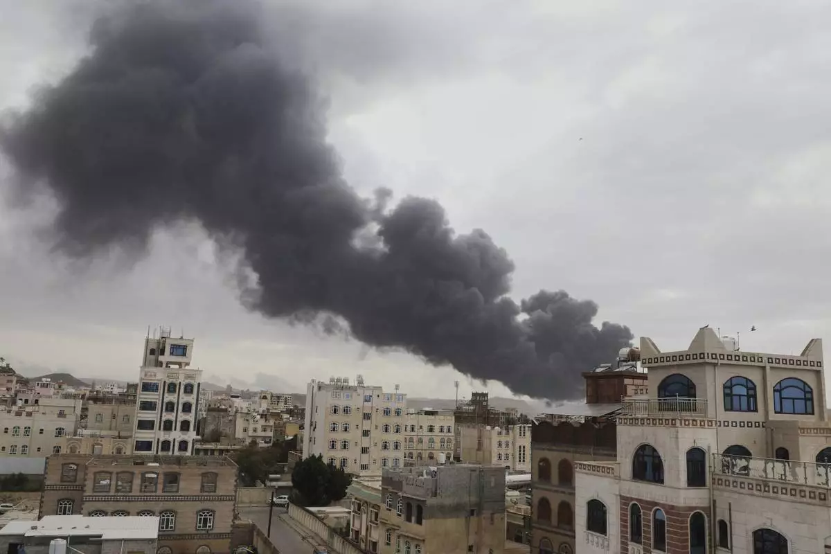 Smoke billows following Israeli airstrikes targeting a power plant and Sanaa Airport, in Sanaa, Yemen, Tuesday, May 6, 2025. (AP Photo/Osamah Abdulrahman)