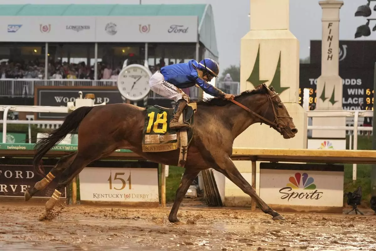 Sovereignty, ridden by Junior Alvarado, crosses the finish line to win the 151st running of the Kentucky Derby horse race at Churchill Downs Saturday, May 3, 2025, in Louisville, Ky. (AP Photo/Jeff Roberson)