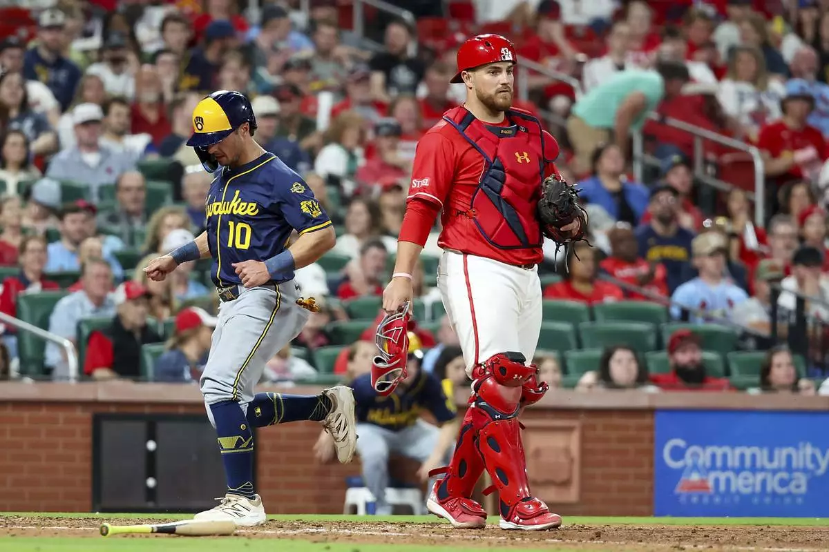 St. Louis Cardinals catcher Pedro Pagés, right, looks on as Milwaukee Brewers' Sal Frelick scores behind him during the seventh inning of a baseball game Friday, April 25, 2025, in St. Louis. (AP Photo/Scott Kane)