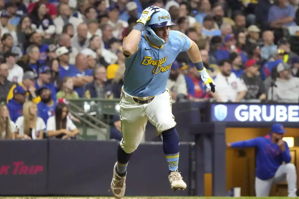 Milwaukee Brewers' Sal Frelick runs to first base on a single to shallow center field during the fourth inning of a baseball game against the Chicago Cubs, Friday, May 2, 2025, in Milwaukee. (AP Photo/Kayla Wolf)