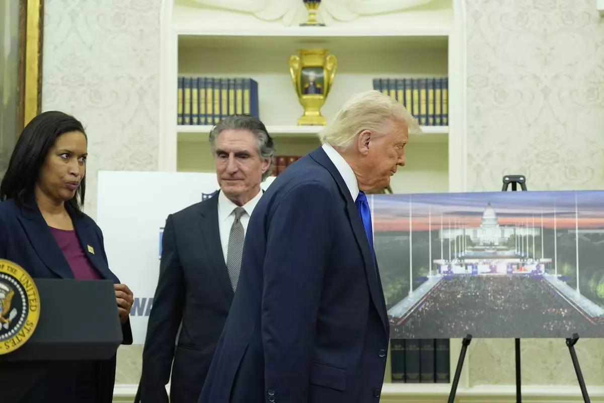 President Donald Trump, from right, departs as Interior Secretary Doug Burgum and District of Columbia Mayor Muriel Bowser look on after an event to announce that the 2027 NFL Draft will be held on the National Mall, in the Oval Office of the White House, Monday, May 5, 2025, in Washington. (AP Photo/Alex Brandon)