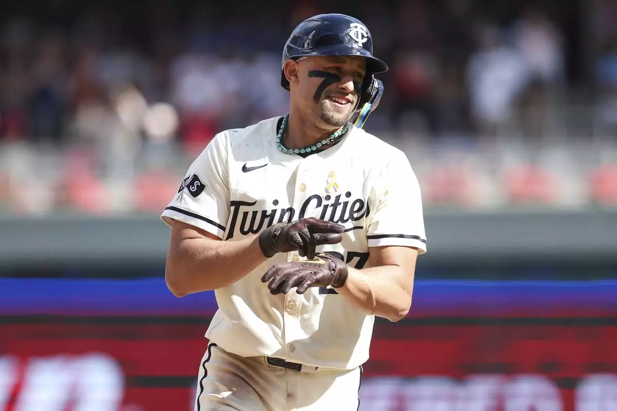FILE - Minnesota Twins' Royce Lewis celebrates his three-run home run as he runs the bases during the eighth inning of a baseball game against the Toronto Blue Jays, Sept. 1, 2024, in Minneapolis. (AP Photo/Matt Krohn, file)