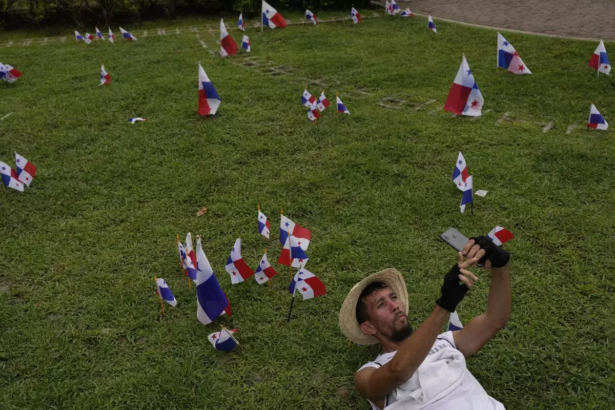 A man takes a selfie during a protest against the government's decision to sign a memorandum of understanding on security cooperation with the U.S. that protesters believe violates their nation's sovereignty in Panama City, Tuesday, May 6, 2025. (AP Photo/Matias Delacroix)