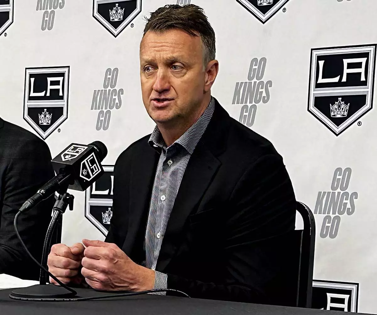 FILE - Los Angeles Kings general manager Rob Blake speaks to reporters at the NHL hockey club's training complex in El Segundo, Calif., May 23, 2024. (AP Photo/Greg Beacham, file)