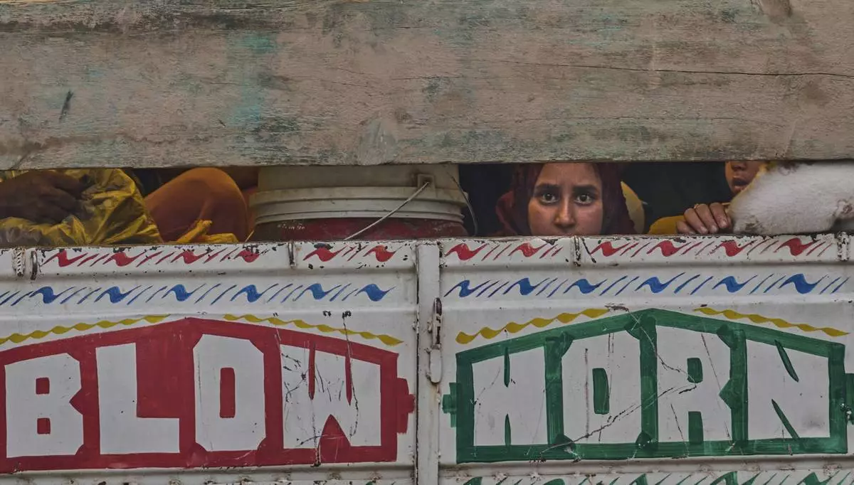 A Kashmiri woman looks from a truck as she along with her family members leave their village following overnight shelling from Pakistan at Gingal village in Uri district, Indian controlled Kashmir, Friday, May 9, 2025. (AP Photo/Dar Yasin)