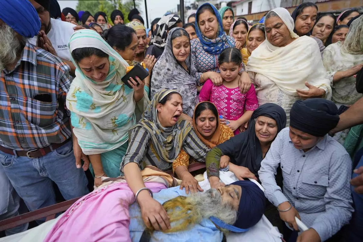 Relatives mourn near the body of Amarjeet Singh, 51, killed in Pakistani artillery shelling in in Poonch along the Line of Control, Indian controlled Kashmir, Thursday, May 8, 2025. (AP Photo/Channi Anand)