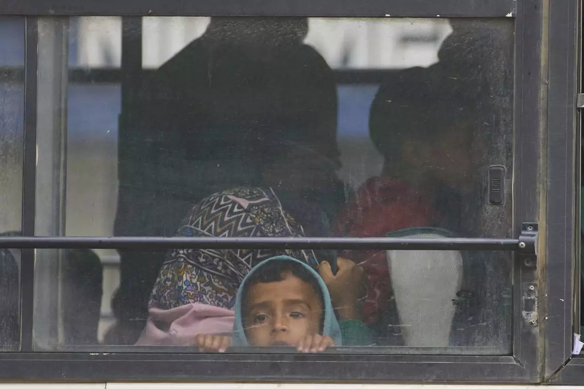 A Kashmiri village boy looks out of the window of a bus after they evacuated their village following overnight shelling from Pakistan at Gingal village in Uri district, Indian controlled Kashmir, Friday, May 9, 2025. (AP Photo/Dar Yasin)