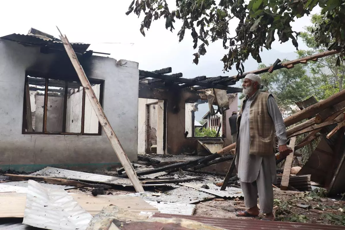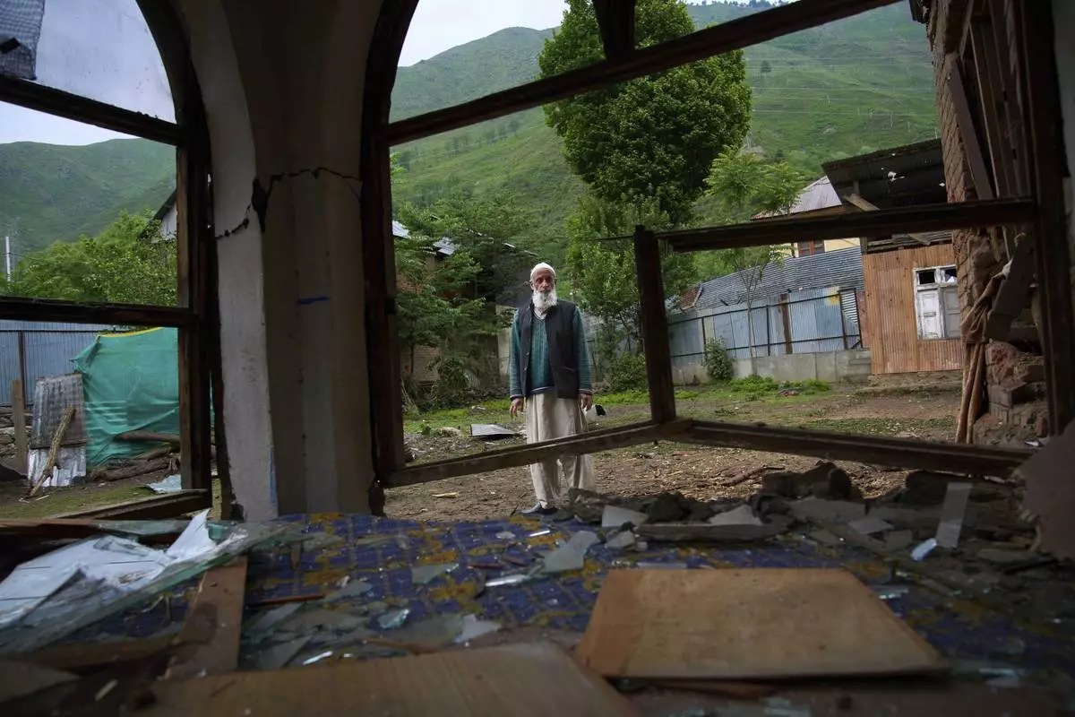 An elderly Kashmiri villager Mohammad Saleem inspects a damaged house after overnight shelling from Pakistan at Gingal village in Uri district, Indian controlled Kashmir, Friday, May 9, 2025. (AP Photo/Dar Yasin)