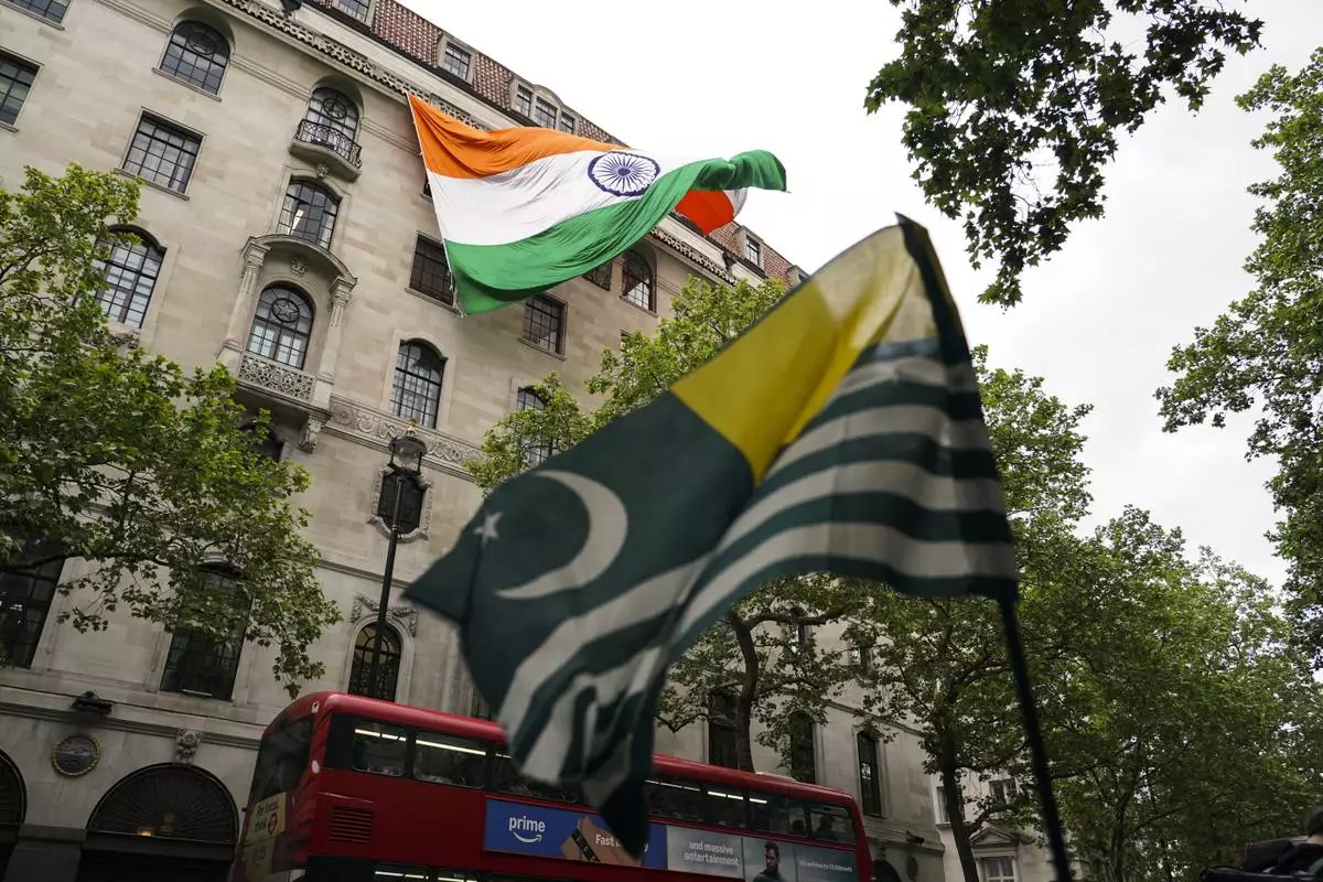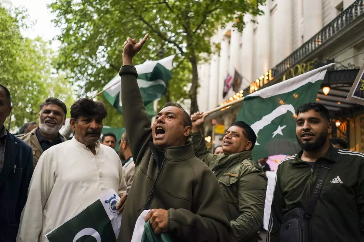 Demonstrators hold Pakistan's flags as they gather to protest outside the India High Commission, in London, Wednesday, May 7, 2025.(AP Photo/Alberto Pezzali)