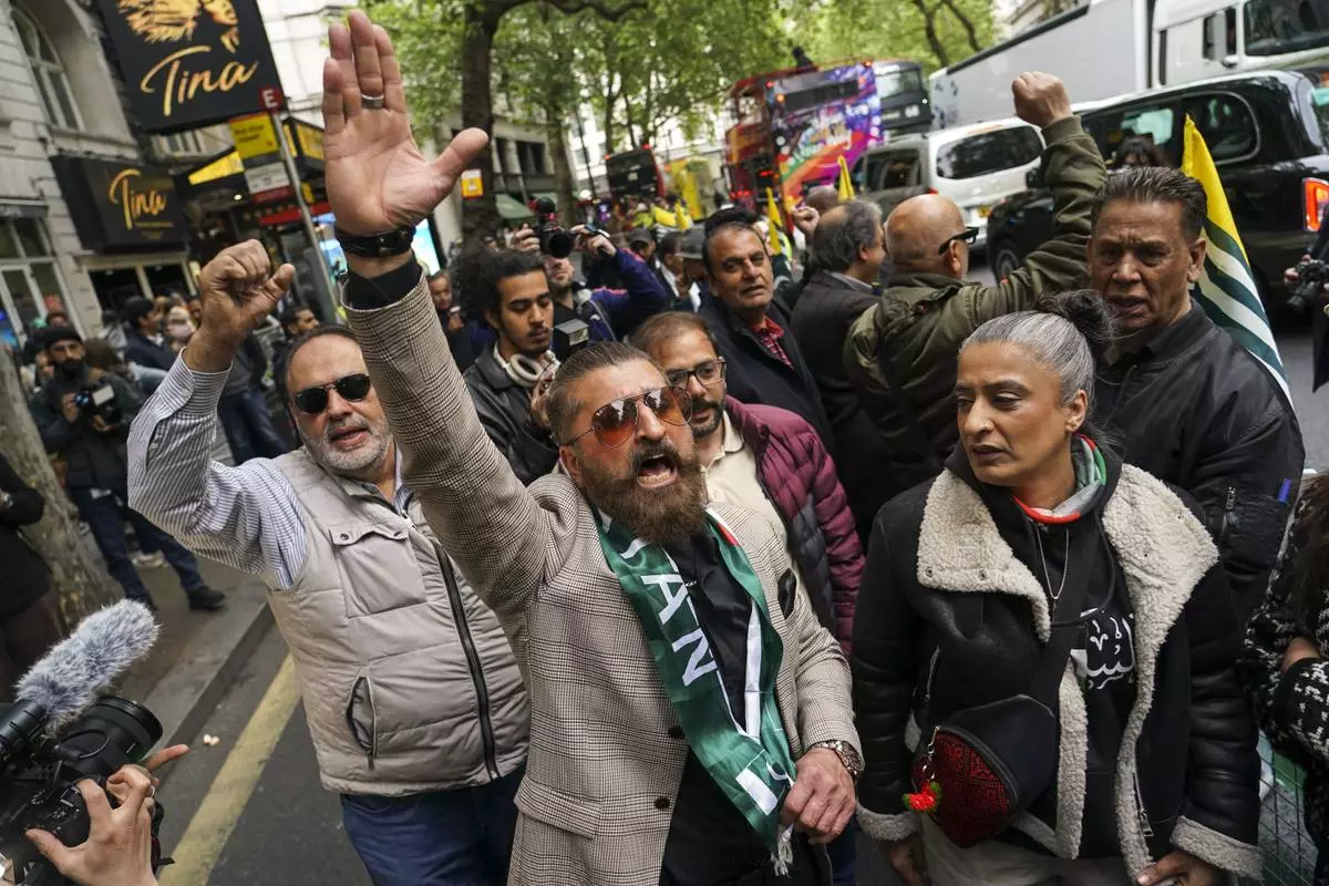 Demonstrators gather to protest outside the India High Commission, in London, Wednesday, May 7, 2025.(AP Photo/Alberto Pezzali)