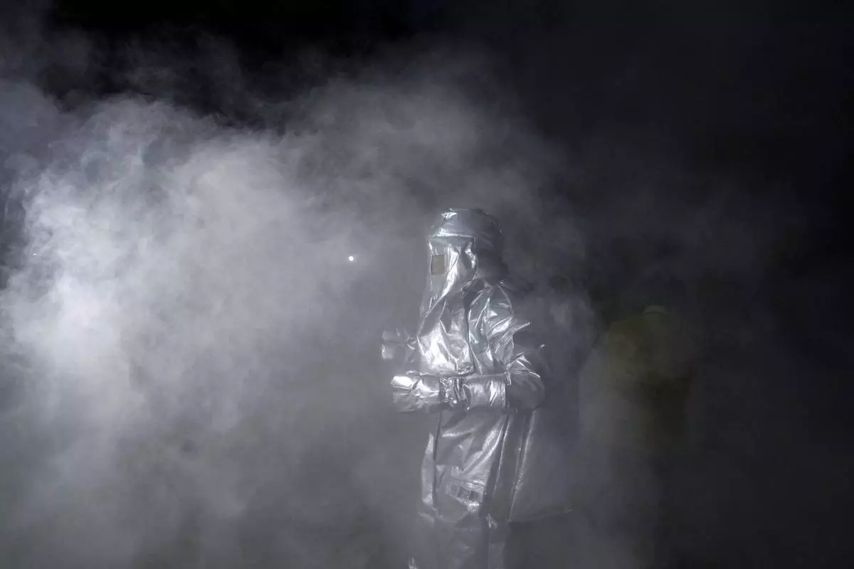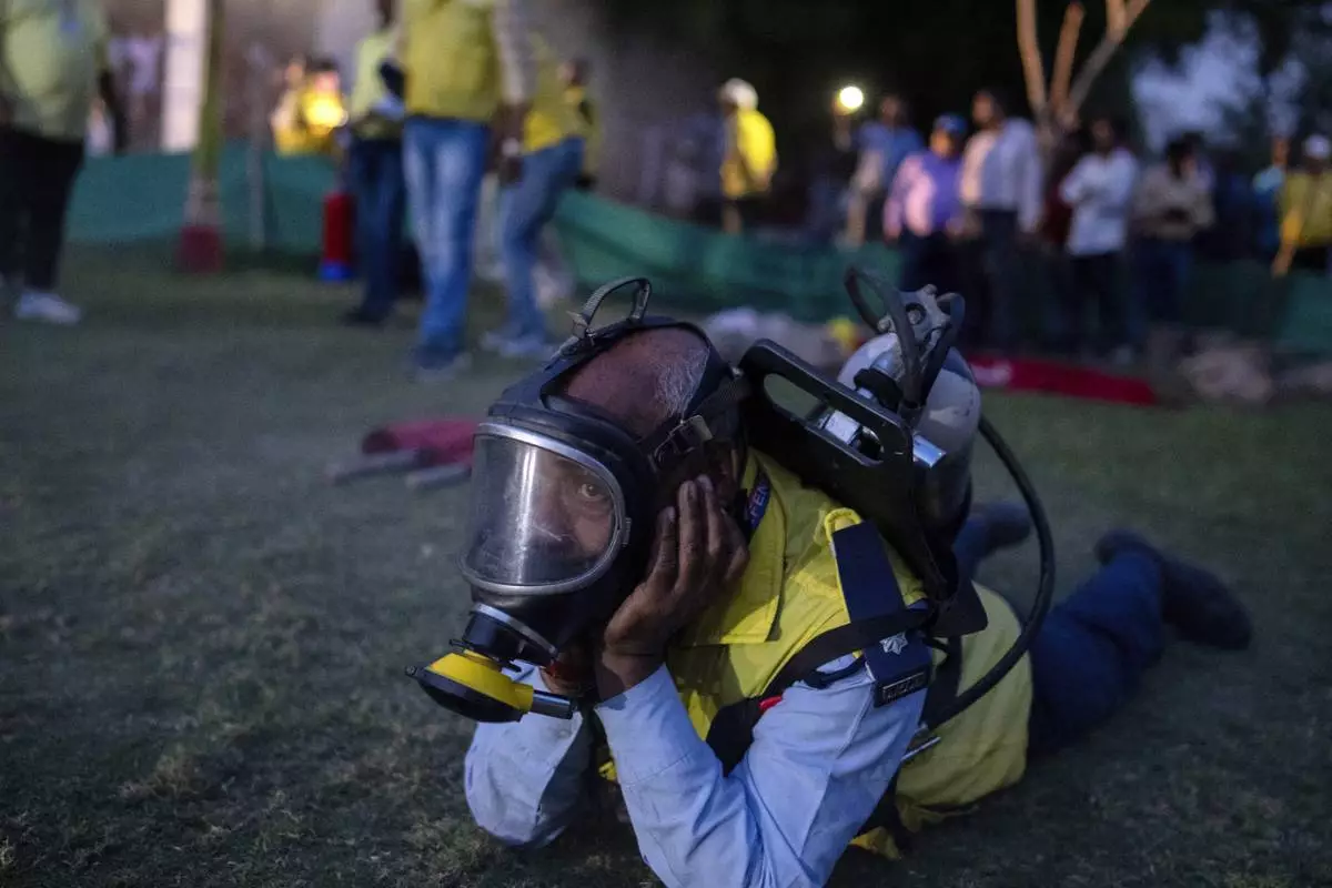A firefighter participates in a drill to help train civilians and security personnel to respond in case of attack in Prayagraj, India, Wednesday, May 7, 2025 amid rising fears of wider conflict following India's strikes in Pakistan. (AP Photo/Rajesh Kumar Singh)