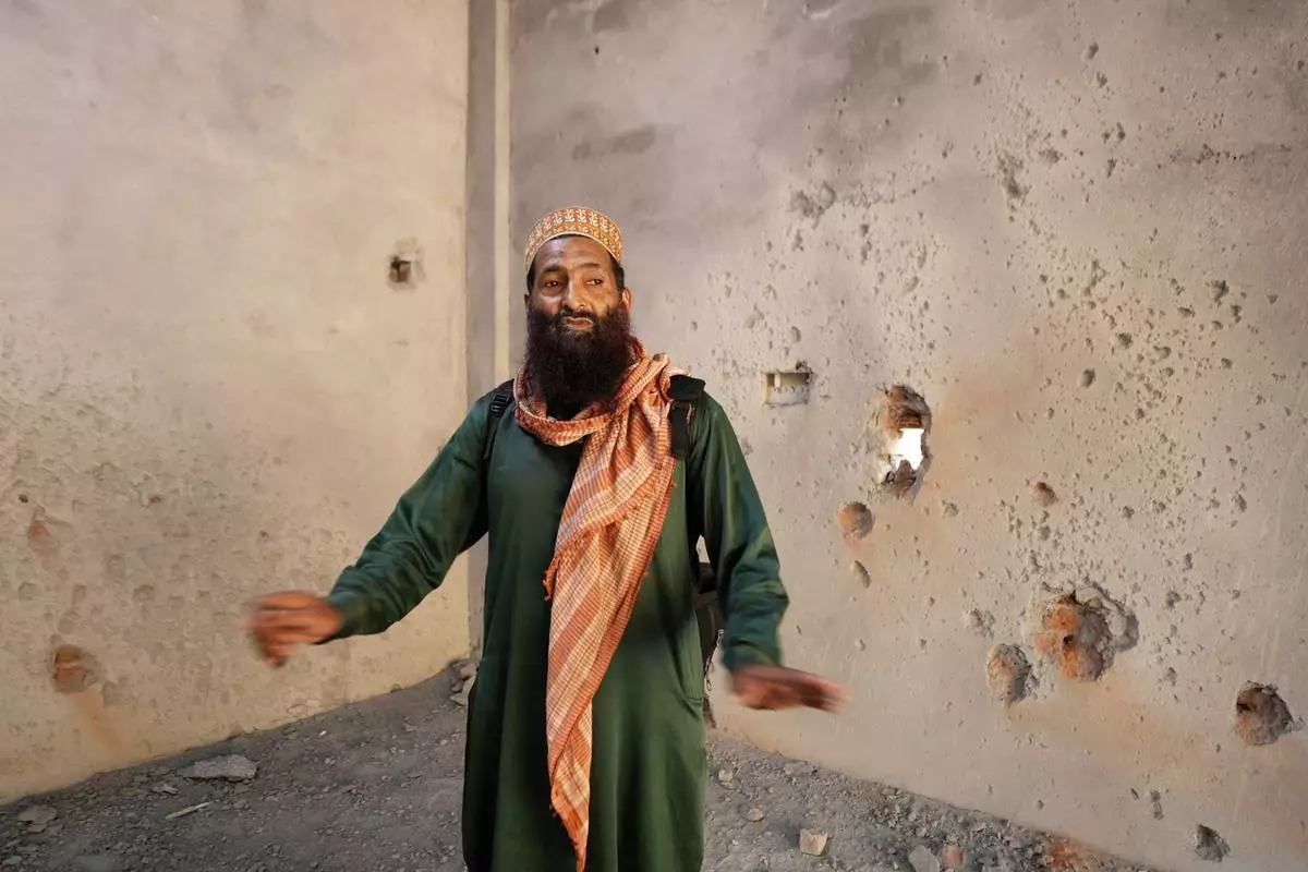 A resident stands next to a house damaged by Pakistani artillery shelling, at Salamabad village in Uri ,north of Srinagar, Indian controlled Kashmir, Wednesday, May 7, 2025. (AP Photo/Junaid Bhat)