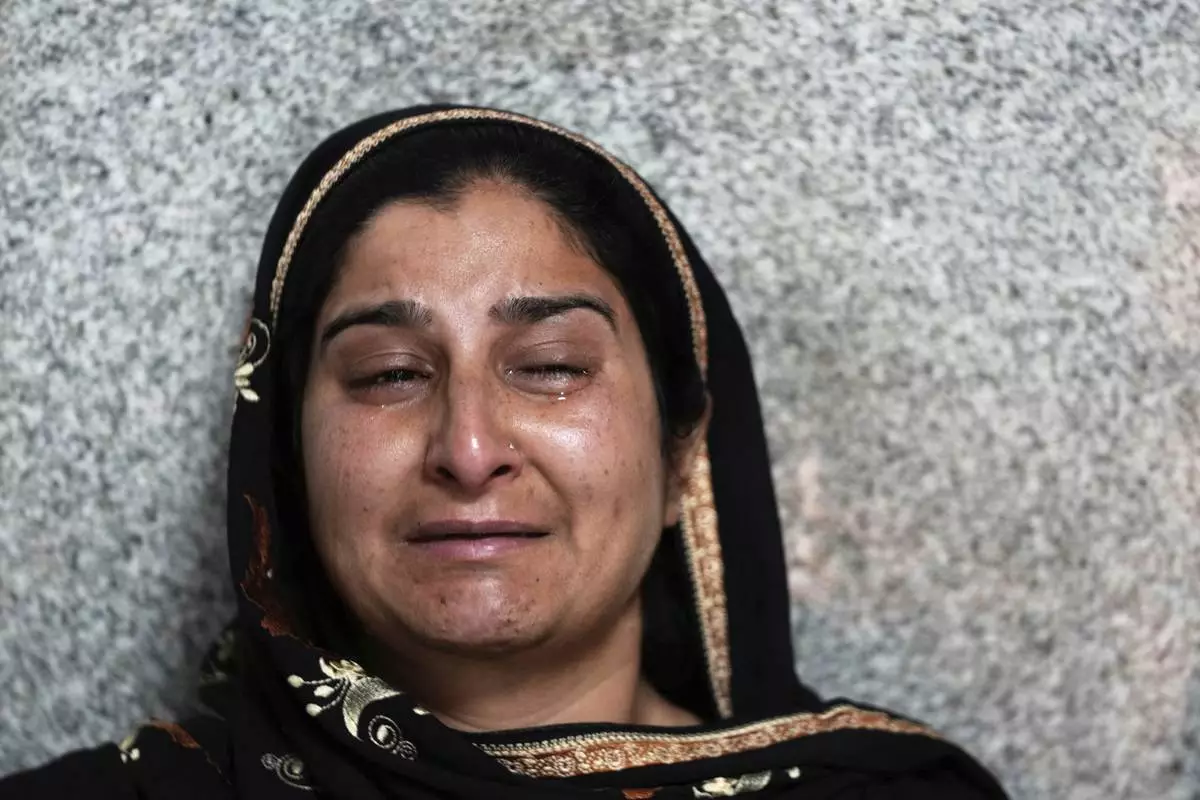 Rameez Khan's wife cries at the hospital where her husband was brought after he was injured during the Pakistani artillery shelling, in Rajouri, India, Wednesday, May 7, 2025. (AP Photo/Channi Anand)