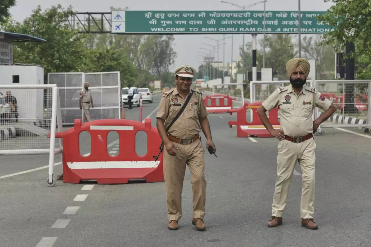 Policemen stand guard on a road leading to the airport in Amritsar, India, after it was closed following India firing missiles into Pakistani-controlled territory, Wednesday, May 7, 2025. (AP Photo/Prabhjot Gill)