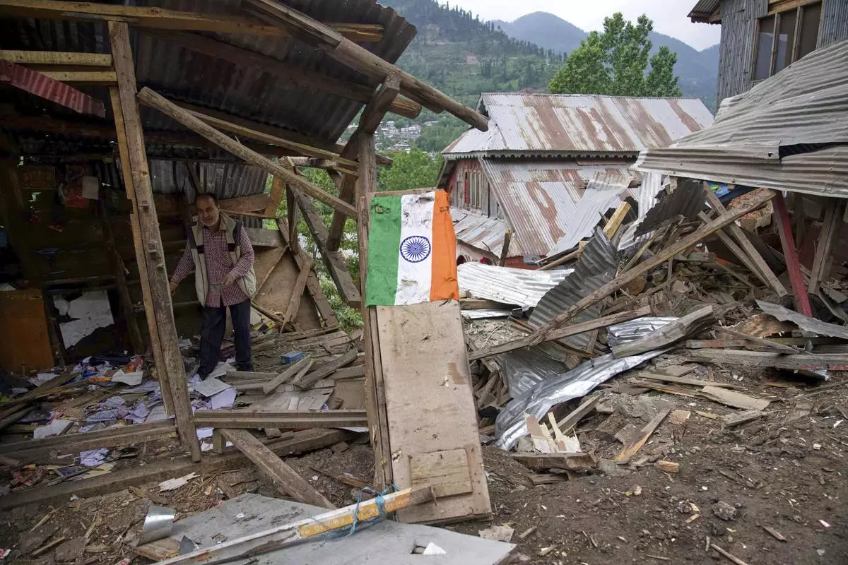 A man inspects the roof of a building that was damaged by Pakistani artillery shelling in Rajouri, India, Wednesday, May 7, 2025. (AP Photo/Channi Anand)