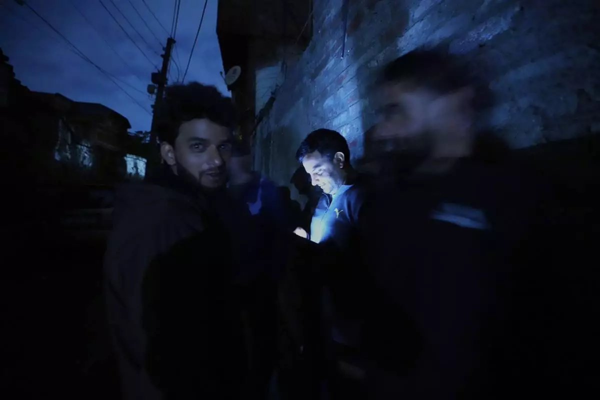 Kashmiri boys watch online news on their cell phone during a blackout after residents reported hearing explosions and sirens in Srinagar, Indian controlled Kashmir, Friday, May 9, 2025. (AP Photo/Mukhtar Khan)