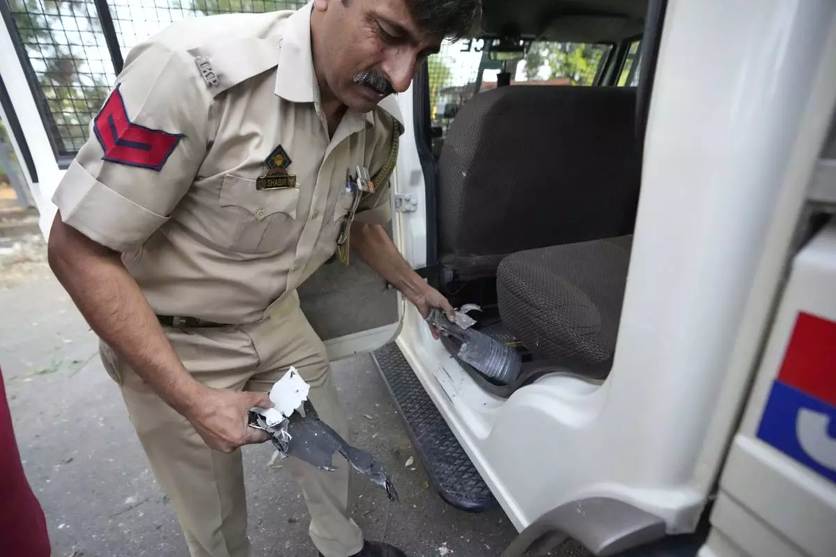 A policeman collects the parts of a drone after an attack on a residential building in Jammu, India, Saturday, May 10, 2025. (AP Photo/Channi Anand)