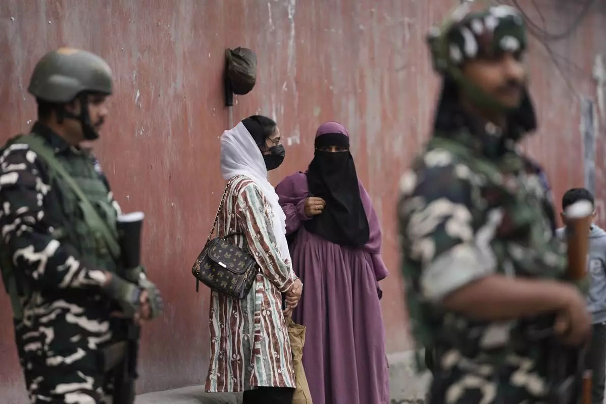 Indian soldiers guard as Kashmiri Muslim women wait for transport, in Srinagar, Indian controlled Kashmir, Friday, May 9, 2025. (AP Photo/Mukhtar Khan)