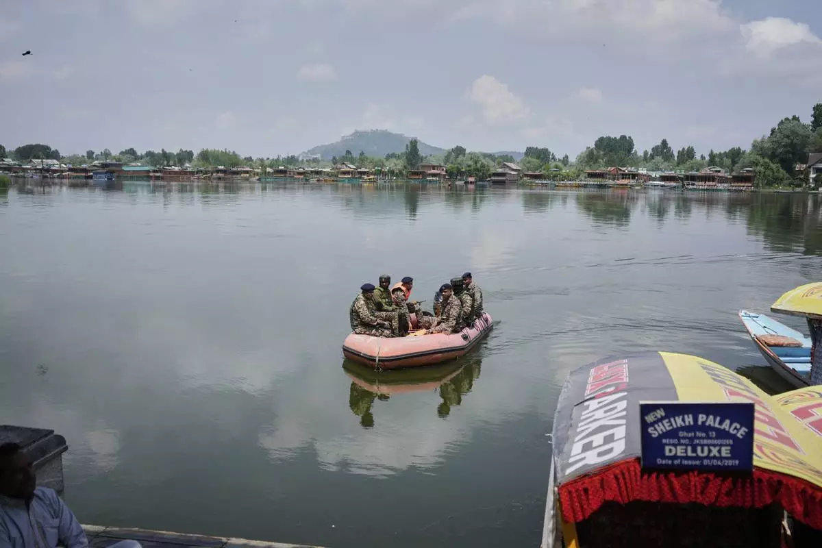 Paramilitary soldiers patrol on an inflatable boat on Dal Lake after loud explosions were heard in Srinagar, Indian controlled Kashmir, Saturday, May 10, 2025.(AP Photo/Mukhtar Khan)