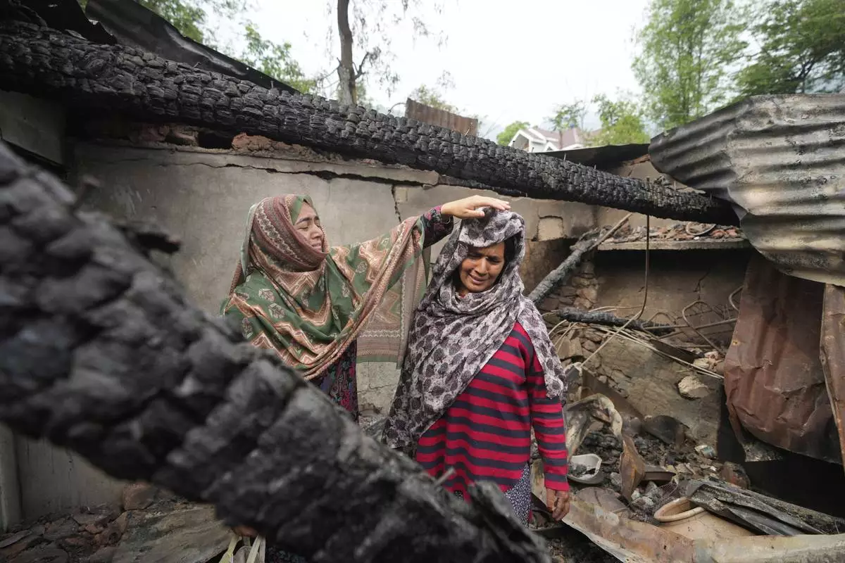 A relative comforts Rubina Begum as she wails inside her house damaged by Pakistani artillery shelling, at Salamabad village in Uri, north of Srinagar, Indian controlled Kashmir, Thursday, May 8, 2025. (AP Photo/Mukhtar Khan)