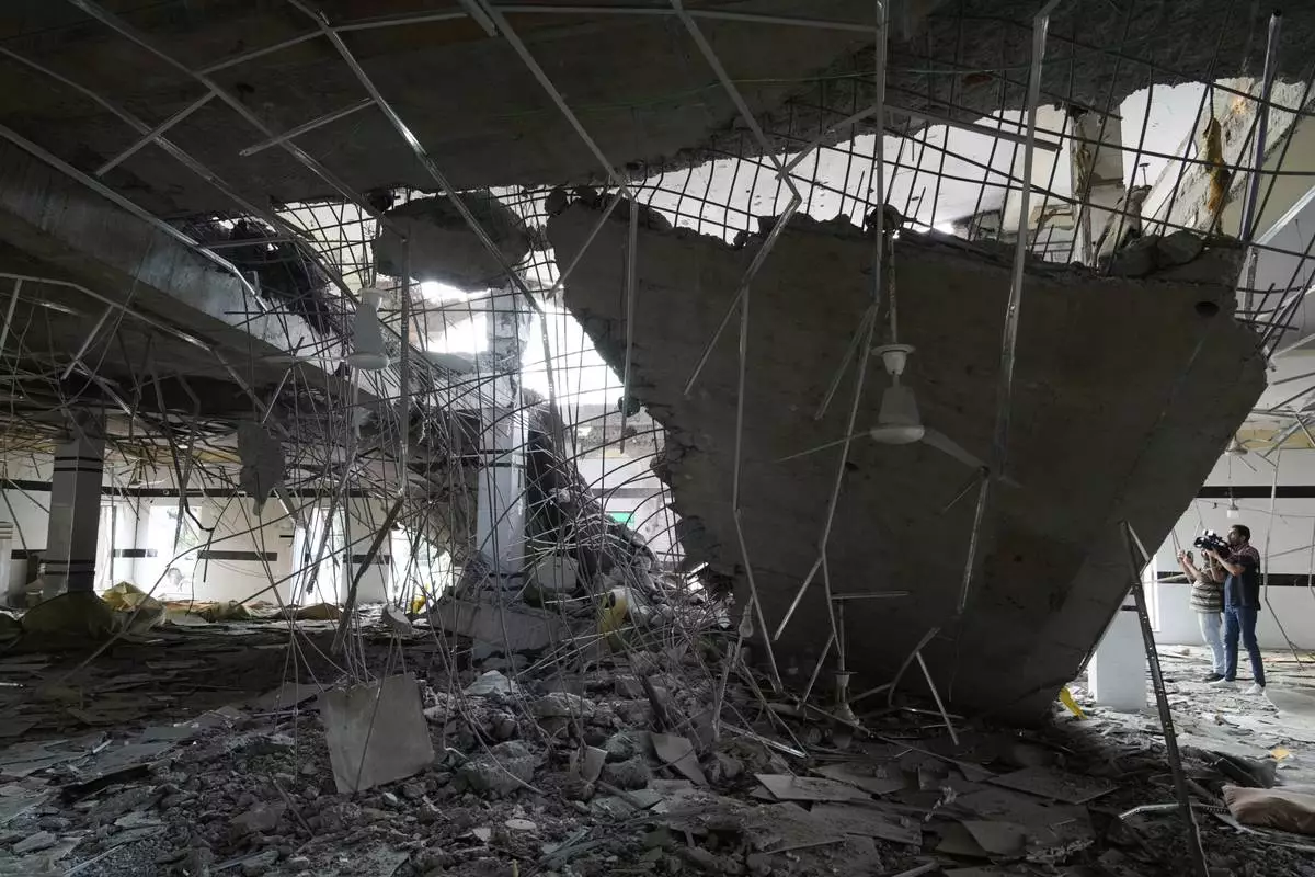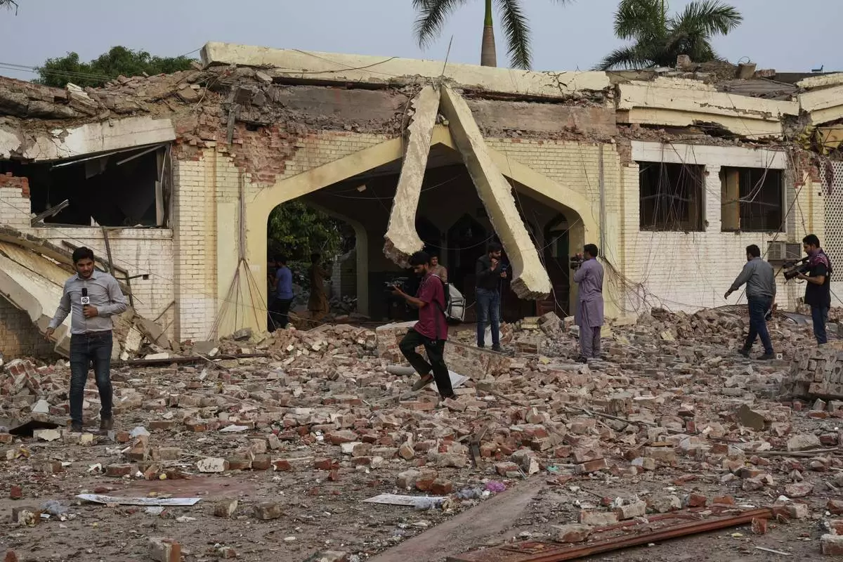 Members of media photograph the rubble of a mosque building damaged by Indian missile attack, in Muridke, a town in Pakistan's Punjab province, Wednesday, May 7, 2025. (AP Photo/K.M. Chaudary)