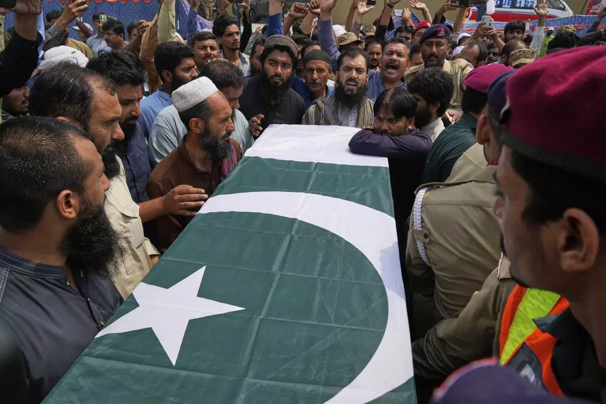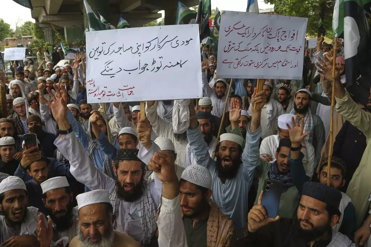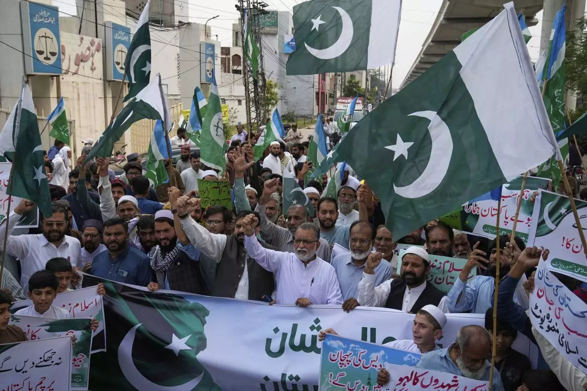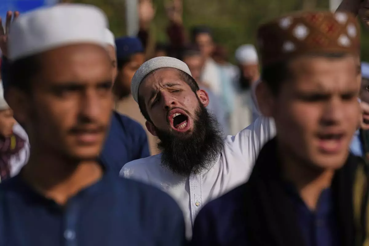 Supporters of a religious group chant anti-India slogans during a demonstration to condemn Indian strikes in Pakistan and to show their support with Pakistan's Army, in Peshawar, Pakistan, Saturday, May 10, 2025. (AP Photo/Muhammad Sajjad)