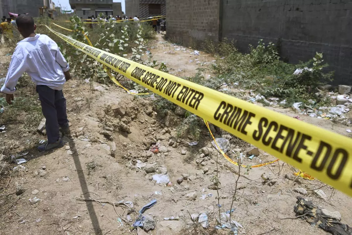Pakistani investigators examine at a cordoned off site, where Pakistan's air defense system shot down a suspected Indian drone, in Karachi, Pakistan, Thursday, May 8, 2025. (AP Photo/Fareed Khan)