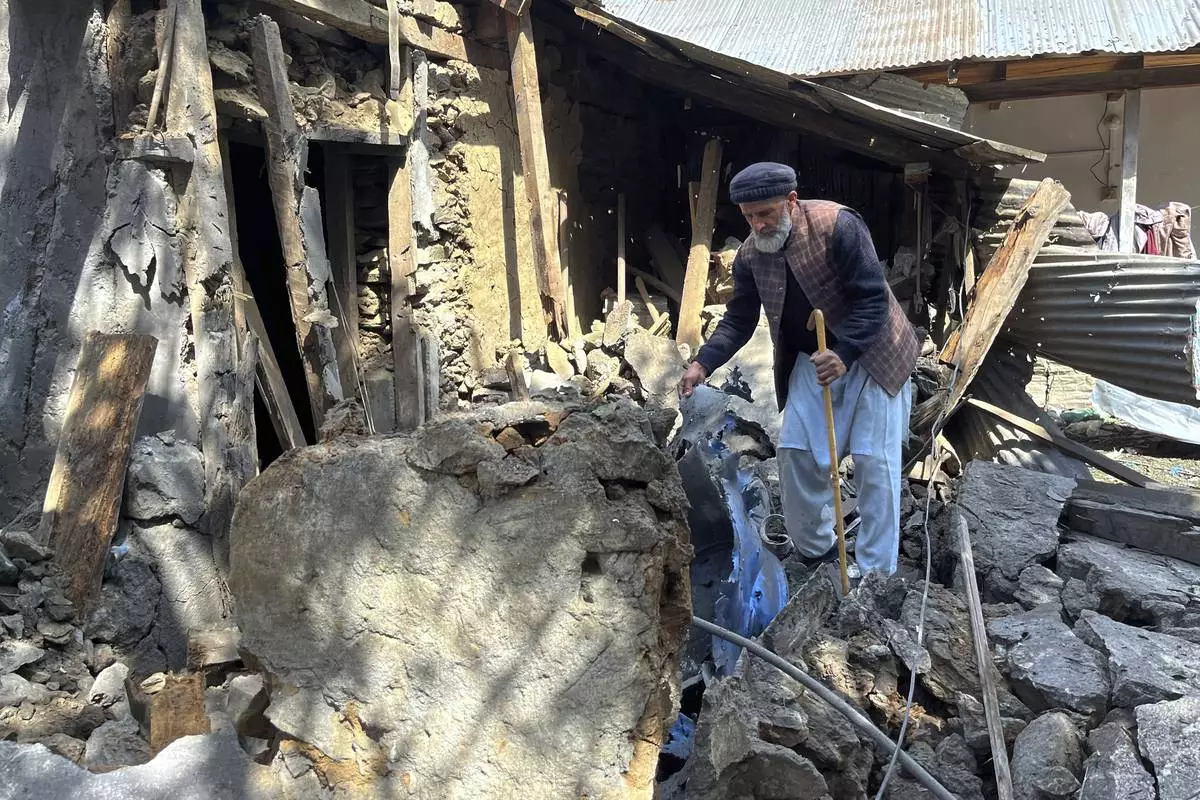 A Kashmiri villager examines damages to his house caused by overnight Indian shelling, in Shah Kot, in Neelum Vallery, a district of Pakistan's administered Kashmir, Saturday, May 10, 2025. (AP Photo/M.D. Mughal)