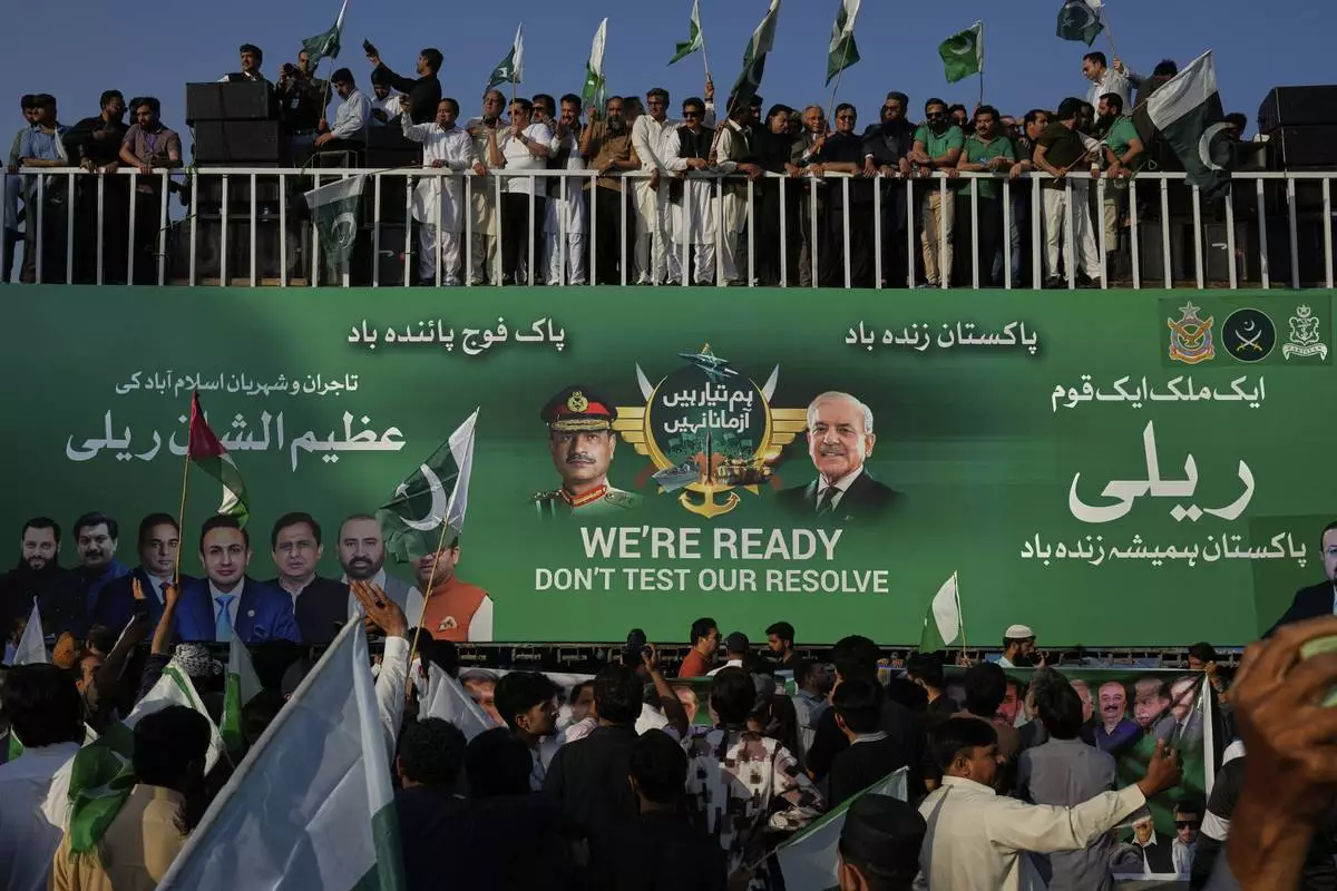 People celebrate Pakistan and India reaching a ceasefire deal, during a demonstration in Karachi, Pakistan, Saturday, May 10, 2025. (AP Photo/Fareed Khan)