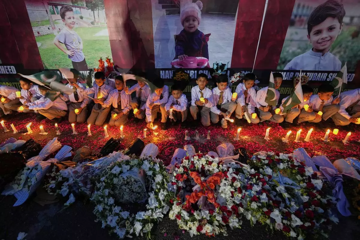 Students place candles during a candle light vigil for children killed in the Indian missile strikes, in Islamabad, Pakistan Thursday, May 8, 2025. (AP Photo/Anjum Naveed)